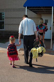 We dropped off brother first and then there is a big time lag before her drop off time. When I go back to work, E's drop off will be in the middle here, but for now, there's a gap. So, we had coffee/milk together and then it was finally time. She walked in holding her Daddy's hand wearing her new cherry backpack from Grammie.